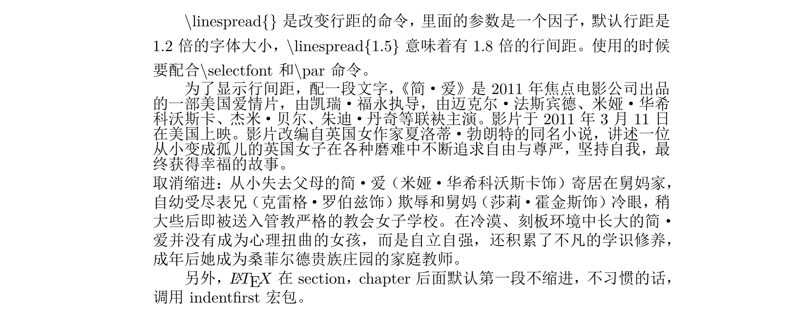 1 2 3 4 5 6 7 8 9 10 11 12 13 14 15 16 17 18 19 20 21 22 23 24 \documentclass {ctexart}\begin {document}\textbackslash linespread\{ \} 是改变行距的命令,里面的参数是一个因子,默认行距是$ 1.2$ 倍的字体大小, \textbackslash linespread\{ 1.5\} 意味着有$ 1.8$ 倍的行间距。使用的时候要配合\textbackslash selectfont 和\textbackslash par命令。 \linespread {0.8}\selectfont 为了显示行间距,配一段文字,《简·爱》是2011年焦点电影公司出品的一部美国爱情片, 由凯瑞·福永执导,由迈克尔·法斯宾德、米娅·华希科沃斯卡、杰米·贝尔、朱迪·丹奇等联袂主演。 影片于2011年3月11日在美国上映。影片改编自英国女作家夏洛蒂·勃朗特的同名小说, 讲述一位从小变成孤儿的英国女子在各种磨难中不断追求自由与尊严, 坚持自我,最终获得幸福的故事。\par \noindent \linespread {1}\selectfont 取消缩进:从小失去父母的简·爱(米娅·华希科沃斯卡饰)寄居在舅妈家,自幼受尽表兄(克雷格·罗伯兹饰)欺辱和舅妈(莎莉·霍金斯饰)冷眼,稍大些后即被送入管教严格的教会女子学校。 在冷漠、刻板环境中长大的简·爱并没有成为心理扭曲的女孩,而是自立自强, 还积累了不凡的学识修养,成年后她成为桑菲尔德贵族庄园的家庭教师。\par 另外,LaTeX在section,chapter后面默认第一段不缩进,不习惯的话,调用indentfirst宏包。 \end {document}