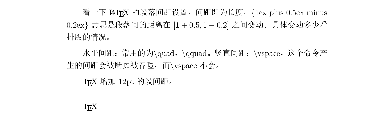 1 2 3 4 5 6 7 8 9 10 11 12 13 14 15 16 17 18 19 20 \documentclass {ctexart}\begin {document} 看一下 \LaTeX 的段落间距设置。间距即为长度,\{ 1ex plus 0.5ex minus 0.2ex\} 意思是 段落间的距离在$ [1+0.5,1-0.2]$ 之间变动。 具体变动多少看排版的情况。\par \setlength {\parskip }{1ex plus 0.5ex minus 0.2ex}水平间距:常用的为\textbackslash quad,\textbackslash qquad。 \setlength {\parskip }{1ex plus 0.5ex minus 0.2ex}竖直间距:\textbackslash vspace,这个命令产生的间距会被断页被吞噬 ,而\textbackslash vspace\* 不会。 \TeX 增加12pt的段间距。 \vspace {12pt} \par \TeX \end {document}
