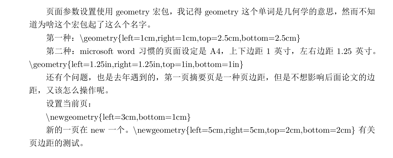 1 2 3 4 5 6 7 8 9 10 11 12 13 14 15 16 17 18 19 20 21 22 23 24 25 26 \documentclass {ctexart}\usepackage {geometry}\begin {document} \newgeometry {left=1.25in,right=1.25in,top=1in,bottom=1in} 页面参数设置使用geometry宏包,我记得geometry这个单词是几何学的意思, 然而不知道为啥这个宏包起了这么个名字。 第一种:\textbackslash geometry\{ left=1cm,right=1cm,top=2.5cm,bottom=2.5cm\} 第二种:microsoft word 习惯的页面设定是A4,上下边距1英寸,左右边距1.25英寸。 \textbackslash geometry\{ left=1.25in,right=1.25in,top=1in,bottom=1in\} 还有个问题,也是去年遇到的,第一页摘要页是一种页边距, 但是不想影响后面论文的边距,又该怎么操作呢。 设置当前页: \textbackslash newgeometry\{ left=3cm,bottom=1cm\} 新的一页在new一个。 \textbackslash newgeometry\{ left=5cm,right=5cm,top=2cm,bottom=2cm\} 有关页边距的测试。 \end {document}
