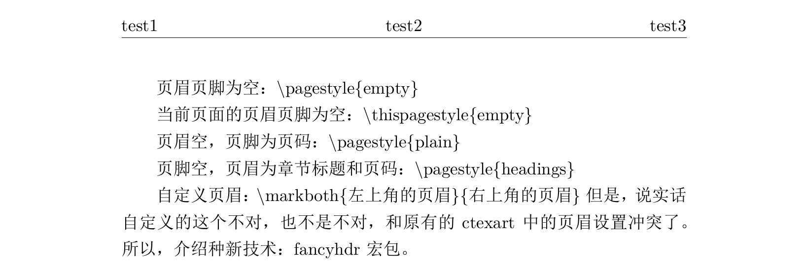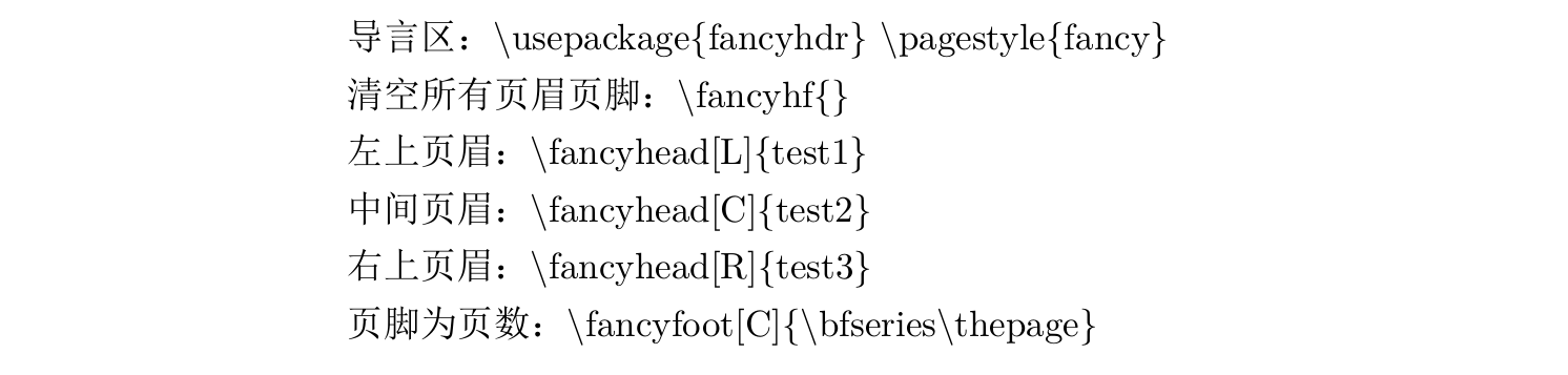 1 2 3 4 5 6 7 8 9 10 11 12 13 14 15 16 17 18 19 20 21 22 23 24 25 26 27 28 29 30 31 32 33 34 35 36 37 38 39 40 41 42 \documentclass {ctexart}\usepackage {fancyhdr}\pagestyle {fancy}\begin {document}页眉页脚为空: \textbackslash pagestyle\{ empty\} 当前页面的页眉页脚为空: \textbackslash thispagestyle\{ empty\} 页眉空,页脚为页码: \textbackslash pagestyle\{ plain\} 页脚空,页眉为章节标题和页码: \textbackslash pagestyle\{ headings\} 自定义页眉: \textbackslash markboth\{ 左上角的页眉\} \{ 右上角的页眉\} 但是,说实话自定义的这个不对,也不是不对,和原有的ctexart中的页眉设置冲突了。 所以,介绍种新技术:fancyhdr宏包。 导言区: \textbackslash usepackage\{ fancyhdr\} \textbackslash pagestyle\{ fancy\} 清空所有页眉页脚: \textbackslash fancyhf\{ \} 左上页眉: \textbackslash fancyhead[L]\{ test1\} 中间页眉: \textbackslash fancyhead[C]\{ test2\} 右上页眉: \textbackslash fancyhead[R]\{ test3\} 页脚为页数: \textbackslash fancyfoot[C]\{ \textbackslash bfseries\textbackslash thepage\} \end {document}