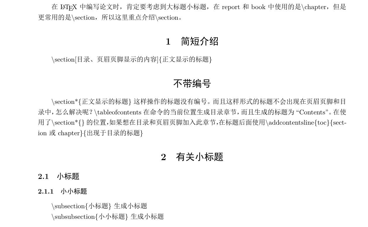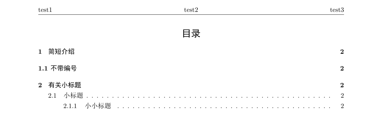 1 2 3 4 5 6 7 8 9 10 11 12 13 14 15 16 17 18 19 20 21 22 23 24 25 26 27 28 29 30 31 32 33 34 35 36 37 38 39 40 41 \documentclass {ctexart}\usepackage {geometry}\geometry {left=2.25cm,right=2.25cm}\usepackage {fancyhdr}\pagestyle {fancy}\begin {document}\fancyhead [L]{test1}\fancyhead [C]{test2}\fancyhead [R]{test3}\fancyfoot [C]{\bfseries \thepage }\tableofcontents \newpage 在 \LaTeX 中编写论文时,肯定要考虑到大标题小标题,在report和book中使用的是\textbackslash chapter, 但是更常用的是\textbackslash section, 所以这里重点介绍\textbackslash section。 \section {简短介绍}\textbackslash section[目录、页眉页脚显示的内容]\{ 正文显示的标题\} \section *{不带编号}\addcontentsline {toc}{section}{1.1不带编号}\textbackslash section*\{ 正文显示的标题\} 这样操作的标题没有编号。而且这样形式的标题不会出现在页眉页脚和目录中,怎么解决呢? \textbackslash tableofcontents 在命令的当前位置生成目录章节,而且生成的标题为``Contents"。在使用了\textbackslash section*\{ \} 的位置,如果想在目录和页眉页脚加入此章节,在标题后面使 用\textbackslash addcontentsline\{ toc\} \{ sect\- ion或chapter\} \{ 出现于目录的标题\} \section {有关小标题}\subsection {小标题}\subsubsection {小小标题}\textbackslash subsection\{ 小标题\} 生成小标题\textbackslash subsubsection\{ 小小标题\} 生成小标题\end {document}