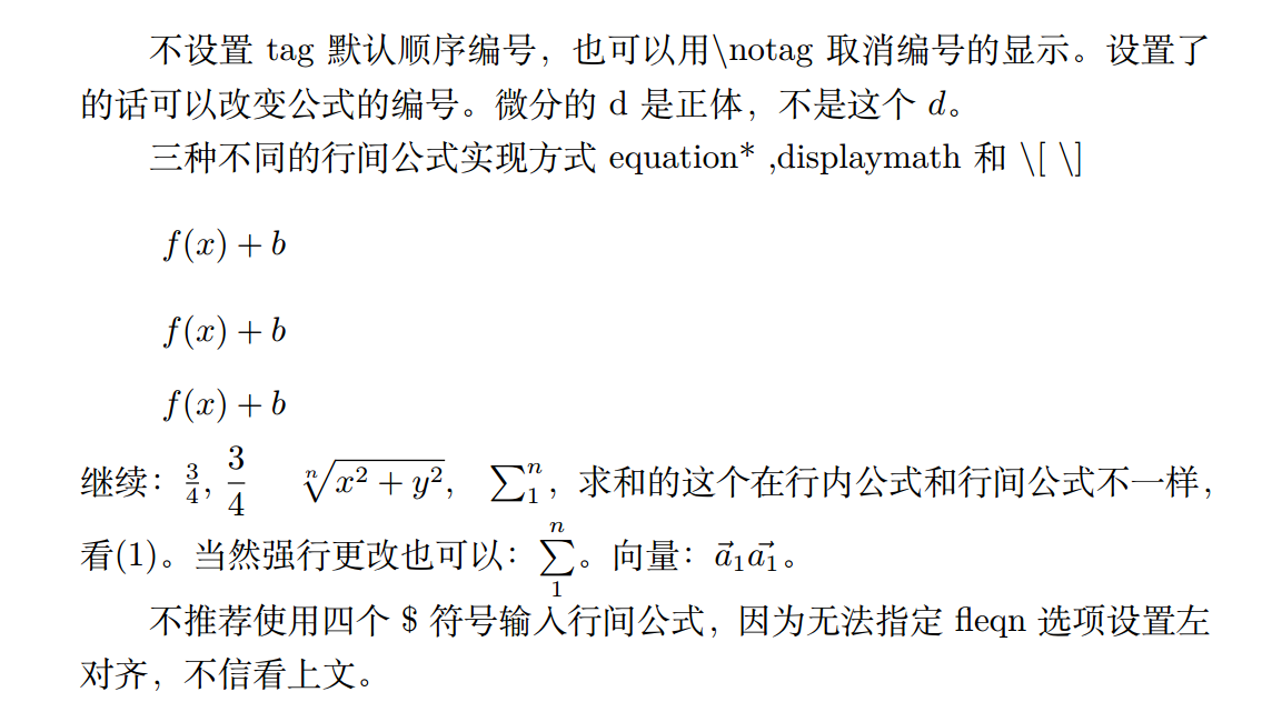 1 2 3 4 5 6 7 8 9 10 11 12 13 14 15 16 17 18 19 20 21 22 23 24 25 26 27 28 29 30 31 32 33 34 35 36 37 38 39 40 41 42 43 \documentclass [fleqn]{ctexart}\usepackage {amsmath}\begin {document}进入数学模式,行内公式:$ a+b=c$ ,与文字混排。 行间公式:$ $ a^ 2+b^ 2=c^ 2$ $ 编号与引用: \begin {equation} \lim _ {n \to \infty }\sum _ {k=1}^ {n}\frac {1}{k^ 2}=\frac {\pi ^ 2}{6} \label {eq1} \end {equation}根据\eqref {eq1},我们blablabla\ref {eq1},两种引用方式的区别。 \begin {equation}\int _ {0}^ {\frac {\pi }{2}} f''(x)\mathrm {d}x=1\tag {3}\end {equation}\begin {equation} \int _ {0}^ {\frac {\pi }{2}} f''(x)\mathrm {d}x=1\notag \end {equation} 不设置tag默认顺序编号,也可以用\textbackslash notag 取消编号的显示。 设置了的话可以改变公式的编号。微分的$ \mathrm {d}$ 是正体,不是这个$ d$ 。 三种不同的行间公式实现方式 equation* ,displaymath 和 \textbackslash [ \textbackslash ] \begin {equation*} f(x) + b \end {equation*}\[ f(x) + b \] \begin {displaymath} f(x) + b \end {displaymath}继续:$ \frac {3}{4}$ , $ \displaystyle {\frac {3}{4}}$ \quad $ \sqrt [n]{x^ 2+y^ 2}$ ,\quad $ \sum _ {1}^ {n}$ , 求和的这个在行内公式和行间公式不一样,看\eqref {eq1}。 当然强行更改也可以:$ \sum \limits _ {1}^ {n}$ 。向量:$ \vec {a}_ 1$ $ \vec {a_ 1}$ 。 不推荐使用四个\$ 符号输入行间公式,因为无法指定fleqn选项设置左对齐,不信看上文。 \end {document}