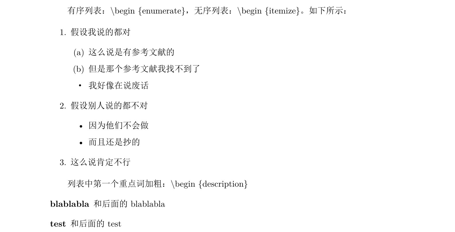 列表 1 2 3 4 5 6 7 8 9 10 11 12 13 14 15 16 17 18 19 20 21 22 23 24 25 26 27 28 29 \documentclass {ctexart}\begin {document}有序列表:\textbackslash begin \{ enumerate\} , 无序列表:\textbackslash begin \{ itemize\} 。 如下所示: \begin {enumerate} \item 假设我说的都对 \begin {enumerate} \item 这么说是有参考文献的 \item 但是那个参考文献我找不到了 \item [·] 我好像在说废话 \end {enumerate} \item 假设别人说的都不对 \begin {itemize} \item 因为他们不会做 \item 而且还是抄的 \end {itemize} \item 这么说肯定不行 \end {enumerate}列表中第一个重点词加粗:\textbackslash begin \{ description\} \begin {description} \item [blablabla] 和后面的blablabla \item [test] 和后面的test \end {description}\end {document}
