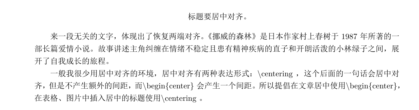1 2 3 4 5 6 7 8 9 10 11 12 13 14 15 16 \documentclass {ctexart}\begin {document}\begin {center}标题要居中对齐。 \end {center}来一段无关的文字,体现出了恢复两端对齐。《挪威的森林》是日本作家村上春树于1987年所著的一部长篇爱情小说。 故事讲述主角纠缠在情绪不稳定且患有精神疾病的直子和开朗活泼的小林绿子之间, 展开了自我成长的旅程。\par 一般我很少用居中对齐的环境,居中对齐有两种表达形式:\textbackslash centering , 这个后面的一句话会居中对齐,但是不产生额外的间距。而\textbackslash begin\{ center\} 会产生一个间距。 所以提倡在文章居中使用\textbackslash begin\{ center\} , 在表格、图片中插入居中的标题使用\textbackslash centering 。 \end {document}