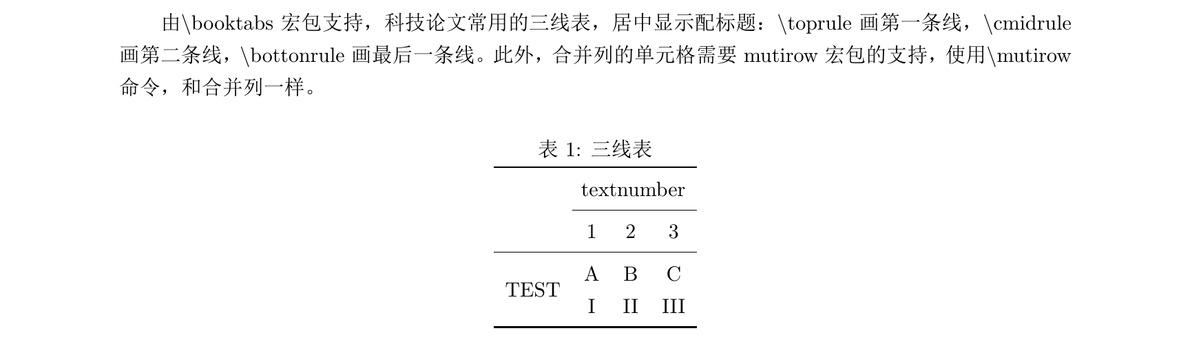 1 2 3 4 5 6 7 8 9 10 11 12 13 14 15 16 17 18 19 20 21 22 23 24 25 26 \documentclass {ctexart}\usepackage {geometry}\geometry {left=2.25cm,right=2.25cm}\usepackage {fancyhdr}\pagestyle {fancy}\usepackage {booktabs}\usepackage {multirow}\begin {document}由\textbackslash booktabs宏包支持,科技论文常用的三线表,居中显示配标题: \begin {table}[h] \centering \caption {三线表} \vspace {3pt} \begin {tabular}{cccc} \toprule \multicolumn {4}{r}{textnumber} \\ \cmidrule {2-4} & 1 & 2 & 3 \\ \midrule \multirow {2}{*}{TEST} & A & B & C \\ & I & II & III \\ \bottomrule \end {tabular} \end {table}\end {document}