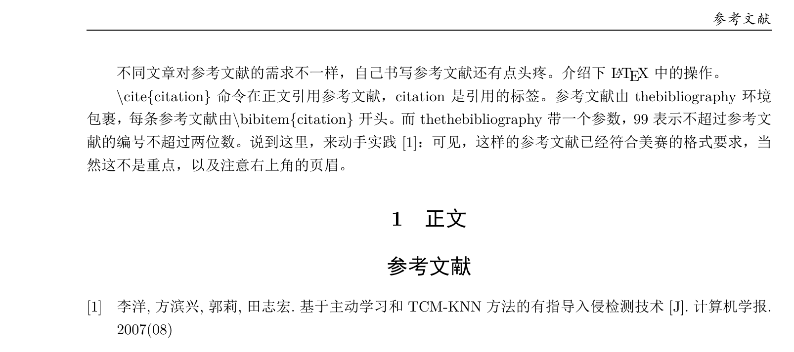 1 2 3 4 5 6 7 8 9 10 11 12 13 14 15 16 17 18 19 20 21 22 \documentclass {ctexart}\usepackage {geometry}\geometry {left=2.25cm,right=2.25cm}\usepackage {fancyhdr}\pagestyle {fancy}\begin {document}不同文章对参考文献的需求不一样,自己书写参考文献还有点头疼。介绍下 \LaTeX 中的操作。 \textbackslash cite\{ citation\} 命令在正文引用参考文献,citation是引用的标签。参考文献由thebibliography环境包裹,每条参考文献由\textbackslash bibitem\{ citation\} 开头。 而thethebibliography带一个参数,99表示不超过参考文献的编号不超过两位数。 说到这里,来动手实践\cite {c1}:可见,这样的参考文献已经符合美赛的格式要求, 当然这不是重点,以及注意右上角的页眉。 \section {正文}\begin {thebibliography}{99} \bibitem [1]{c1} 李洋,方滨兴,郭莉,田志宏. 基于主动学习和TCM-KNN方法的有指导入侵检测技术[J]. 计算机学报. 2007(08) \end {thebibliography}\end {document}