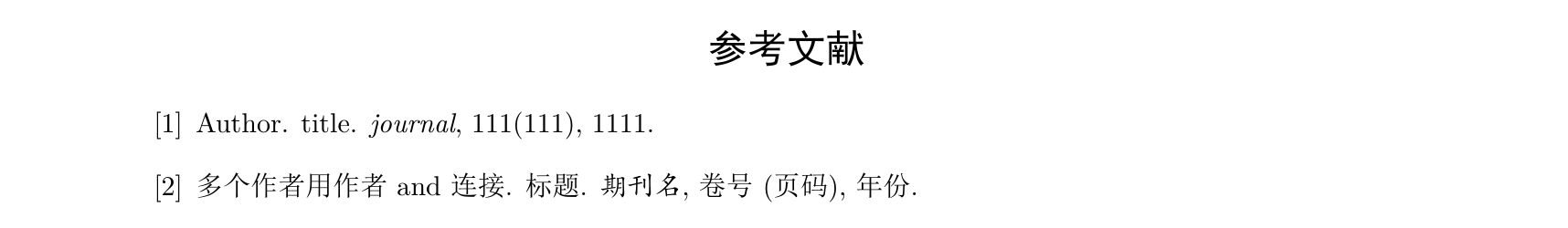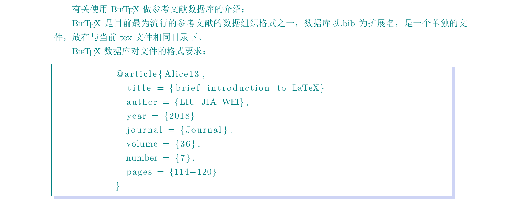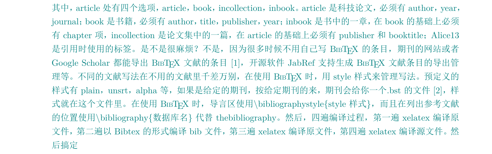 bib文件的书写 1 2 3 4 5 6 7 8 9 10 11 12 13 14 15 16 17 18 19 20 21 22 23 24 25 26 27 28 29 30 31 32 33 34 35 36 37 38 39 40 41 42 43 44 45 46 47 48 49 50 51 52 \documentclass {ctexart}\usepackage {geometry}\usepackage {hologo}\usepackage [numbers,sort& compress]{natbib}\geometry {left=2.25cm,right=2.25cm}\usepackage {fancyhdr}\pagestyle {fancy}\bibliographystyle {plain}\begin {document}\section {正文}{\color {teal}有关使用\hologo {BibTeX}做参考文献数据库的介绍:} {\color {teal}\hologo {BibTeX}是目前最为流行的参考文献的数据组织格式之一, 数据库以.bib为扩展名,是一个单独的文件,放在与当前tex文件相同目录下。} {\color {teal}\hologo {BibTeX}数据库对文件的格式要求:\begin {lstlisting} @article{Alice13, title = {brief introduction to LaTeX} author = {LIU JIA WEI}, year = {2018} journal = {Journal}, volume = {36}, number = {7}, pages = {114-120} } \end {lstlisting}其中,article处有四个选项,article,book,incollection,inbook。 article是科技论文,必须有author,year,journal;book是书籍,必须有author,title,publisher,year; inbook是书中的一章,在book的基础上必须有chapter项, incollection是论文集中的一篇,在article的基础上必须有publisher和booktitle; Alice1是引用时使用的标签。 是不是很麻烦?不是,因为很多时候不用自己写\hologo {BibTeX}的条目, 期刊的网站或者Google Scholar都能导出\hologo {BibTeX}文献的条目\cite {Alice1}, 开源软件JabRef支持生成\hologo {BibTeX}文献条目的导出管理等。 不同的文献写法在不用的文献里千差万别,在使用\hologo {BibTeX}时,用style样式来管理写法。 预定义的样式有plain,unsrt,alpha等,如果是给定的期刊,按给定期刊的来, 期刊会给你一个.bst的文件\cite {Alice2},样式就在这个文件里。 在使用\hologo {BibTeX}时,导言区使用\textbackslash bibliographystyle\{ style样式\} , 而且在列出参考文献的位置使用\textbackslash bibliography\{ 数据库名\} 代替thebibliography。 然后,四遍编译过程,第一遍xelatex编译原文件, 第二遍以Bibtex的形式编译bib文件,第三遍xelatex编译原文件, 第四遍xelatex编译源文件。然后搞定~} \bibliography {books}\end {document}