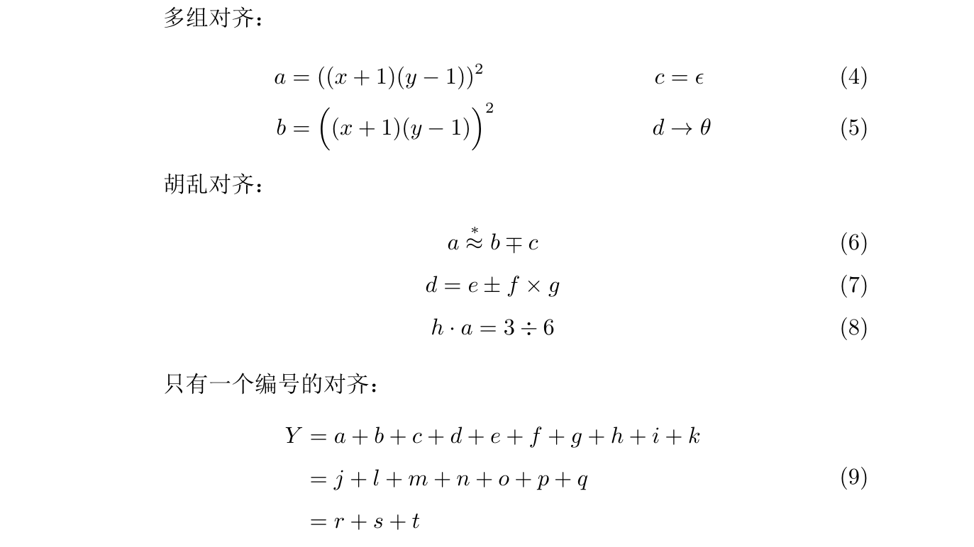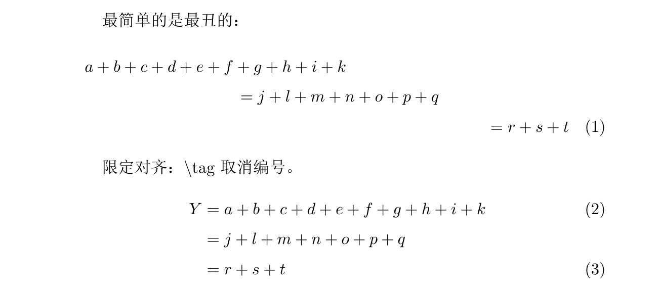 1 2 3 4 5 6 7 8 9 10 11 12 13 14 15 16 17 18 19 20 21 22 23 24 25 26 27 28 29 30 31 32 33 34 35 36 37 38 39 \documentclass {ctexart}\usepackage {amsmath}\begin {document}最简单的是最丑的: \begin {multline} a+b+c+d+e+f+g+h+i+k\\ =j+l+m+n+o+p+q\\ =r+s+t \end {multline}限定对齐:\textbackslash tag 取消编号。 \begin {align} Y & = a+b+c+d+e+f+g+h+i+k\\ \notag & = j+l+m+n+o+p+q\\ & = r+s+t \end {align}多组对齐: \begin {align} a & = ((x+1)(y-1))^ 2 & c & = \epsilon \\ b & = \Bigl ((x+1)(y-1)\Bigr )^ 2 & d & \to \theta \end {align}胡乱对齐: \begin {gather} a\stackrel {*}{\approx }b\mp c\\ d=e\pm f\times g\\ h\cdot a=3\div 6 \end {gather}只有一个编号的对齐: \begin {equation}\begin {aligned}Y & = a+b+c+d+e+f+g+h+i+k\\ & = j+l+m+n+o+p+q\\ & = r+s+t\end {aligned}\end {equation}\end {document}
