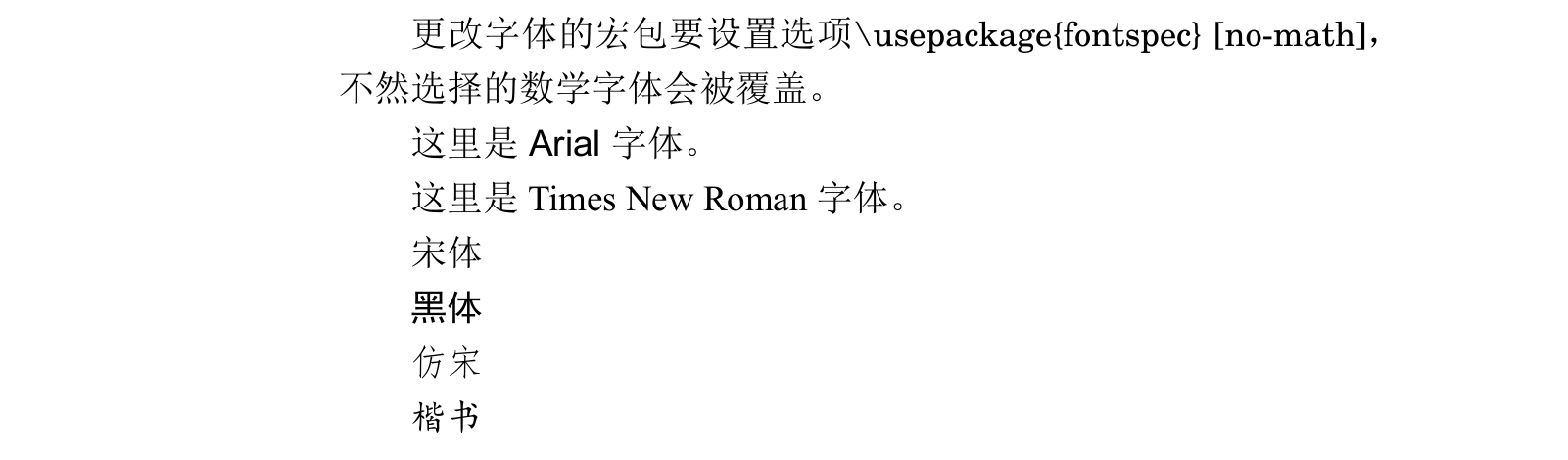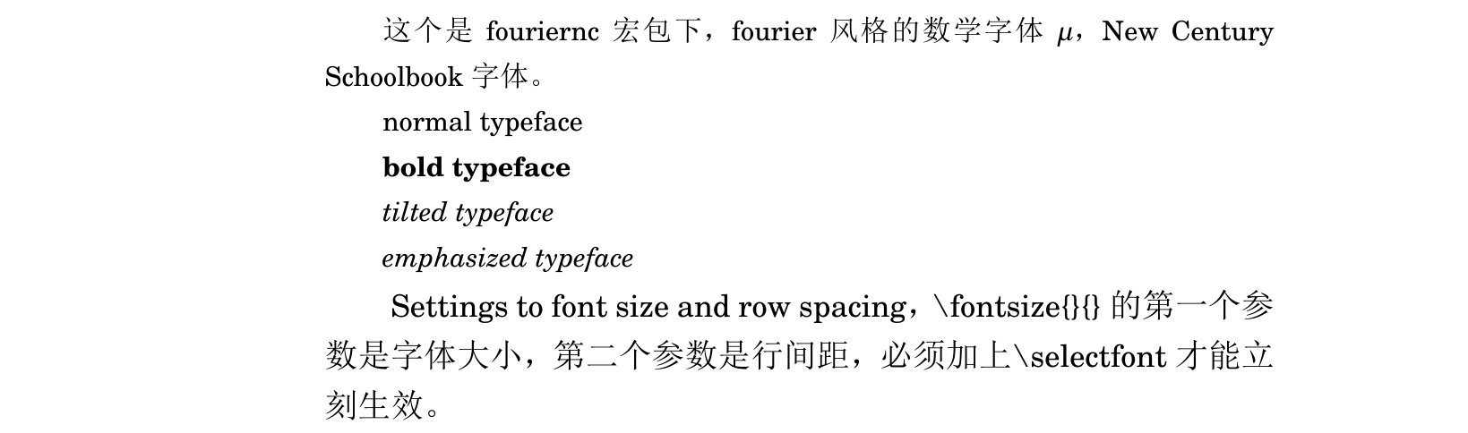 1 2 3 4 5 6 7 8 9 10 11 12 13 14 15 16 17 18 19 20 21 22 23 24 25 26 27 28 29 30 31 32 33 34 35 36 37 \documentclass {ctexart}\usepackage {fouriernc}\usepackage {fontspec}[no-math]\begin {document}这个是fouriernc宏包下,fourier风格的数学字体$ \mu $ ,New Century Schoolbook字体。 normal typeface \textbf {bold typeface}\textit {tilted typeface}\emph {emphasized typeface}\fontsize {12}{14}\selectfont Settings to font size and row spacing,\textbackslash fontsize\{ \} \{ \} 的第一个参数是字体大小,第二个参数是行间距,必须加上\textbackslash selectfont才能立刻生效。 更改字体的宏包要设置选项\textbackslash usepackage\{ fontspec\} [no-math],不然选择的数学字体会被覆盖。 \setmainfont [BoldFont={Arial Bold}]{Arial}这里是Arial字体。 \setmainfont {Times New Roman}这里是Times New Roman字体。 \songti 宋体\heiti 黑体\fangsong 仿宋\kaishu 楷书\end {document}