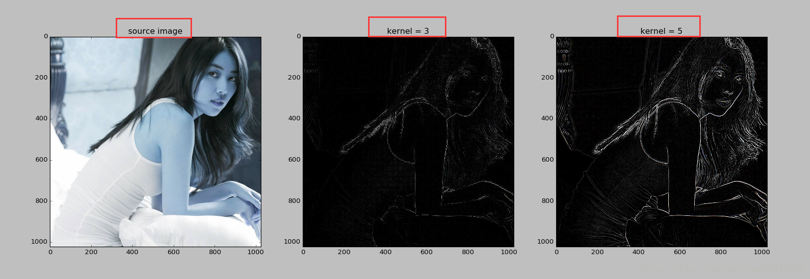 1 2 3 4 5 6 7 8 9 10 11 12 13 14 15 16 17 18 19 20 21 22 23 24 25 26 27 28 29 30 31 32 33 34 import cv2import numpy as npimport matplotlib.pyplot as pltkernel_9 = np.array([[-1 , -1 , -1 ], [-1 , 8 , -1 ], [-1 , -1 , -1 ]]) kernel_25 = np.array([[-1 , -1 , -1 , -1 , -1 ], [-1 , 1 , 2 , 1 , -1 ], [-1 , 2 , 4 , 2 , -1 ], [-1 , 1 , 2 , 1 , -1 ], [-1 , -1 , -1 , -1 , -1 ]]) img = cv2.imread('test.jpg' ) ndimg = np.array(img) k3 = cv2.filter2D(ndimg, -1 , kernel_9) k5 = cv2.filter2D(ndimg, -1 , kernel_25) plt.subplot(131 ) plt.imshow(img) plt.title("source image" ) plt.subplot(132 ) plt.imshow(k3) plt.title("kernel = 3" ) plt.subplot(133 ) plt.imshow(k5) plt.title("kernel = 5" ) plt.show()
