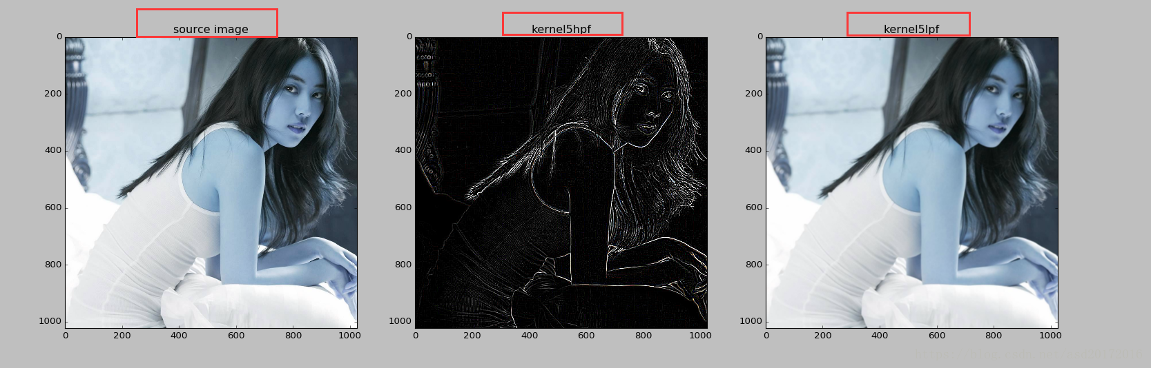 1 2 3 4 5 6 7 8 9 10 11 12 13 14 15 16 17 18 19 20 21 22 23 24 25 26 27 28 29 30 31 32 33 34 import cv2import numpy as npimport matplotlib.pyplot as pltkernel_25h = np.array([[-1 , -1 , -1 , -1 , -1 ], [-1 , 1 , 2 , 1 , -1 ], [-1 , 2 , 4 , 2 , -1 ], [-1 , 1 , 2 , 1 , -1 ], [-1 , -1 , -1 , -1 , -1 ]]) kernel_25l = np.array([[0.04 , 0.04 , 0.04 , 0.04 , 0.04 ], [0.04 , 0.04 , 0.04 , 0.04 , 0.04 ], [0.04 , 0.04 , 0.04 , 0.04 , 0.04 ], [0.04 , 0.04 , 0.04 , 0.04 , 0.04 ], [0.04 , 0.04 , 0.04 , 0.04 , 0.04 ]]) img = cv2.imread('test.jpg' ) ndimg = np.array(img) k3 = cv2.filter2D(ndimg, -1 , kernel_25h) k5 = cv2.filter2D(ndimg, -1 , kernel_25l) plt.subplot(131 ) plt.imshow(img) plt.title("source image" ) plt.subplot(132 ) plt.imshow(k3) plt.title("kernel5hpf" ) plt.subplot(133 ) plt.imshow(k5) plt.title("kernel5lpf" ) plt.show()