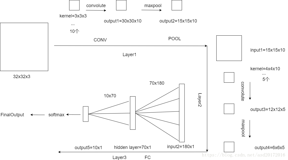 使用Keras搭建卷积神经网络 1 2 3 4 5 6 7 8 9 10 11 12 13 14 15 16 17 18 19 20 21 22 23 24 25 26 27 28 29 30 31 32 33 import numpy as npimport kerasfrom keras.models import Sequentialfrom keras.layers import Dense, Dropout, Flattenfrom keras.layers import Conv2D, MaxPooling2Dx_train = np.random.random((100 , 32 , 32 , 3 )) y_train = keras.utils.to_categorical(np.random.randint(10 , size=(100 , 1 )), num_classes=10 ) x_test = np.random.random((20 , 32 , 32 , 3 )) y_test = keras.utils.to_categorical(np.random.randint(10 , size=(20 , 1 )), num_classes=10 ) model = Sequential() model.add(Conv2D(10 , (3 , 3 ), activation='relu' , input_shape=(32 , 32 , 3 ))) model.add(MaxPooling2D(pool_size=(2 , 2 ))) model.add(Conv2D(5 , (4 , 4 ), activation='relu' , input_shape=(15 , 15 , 10 ))) model.add(MaxPooling2D(pool_size=(2 , 2 ))) model.add(Flatten()) model.add(Dense(180 , activation='relu' )) model.add(Dense(70 , activation='relu' )) model.add(Dense(10 , activation='softmax' )) from keras.optimizers import SGDsgd = SGD(lr=0.01 , decay=1e-6 , momentum=0.9 , nesterov=True ) model.compile (loss='categorical_crossentropy' , optimizer=sgd) model.fit(x_train, y_train, batch_size=32 , epochs=10 ) score = model.evaluate(x_test, y_test, batch_size=32 )