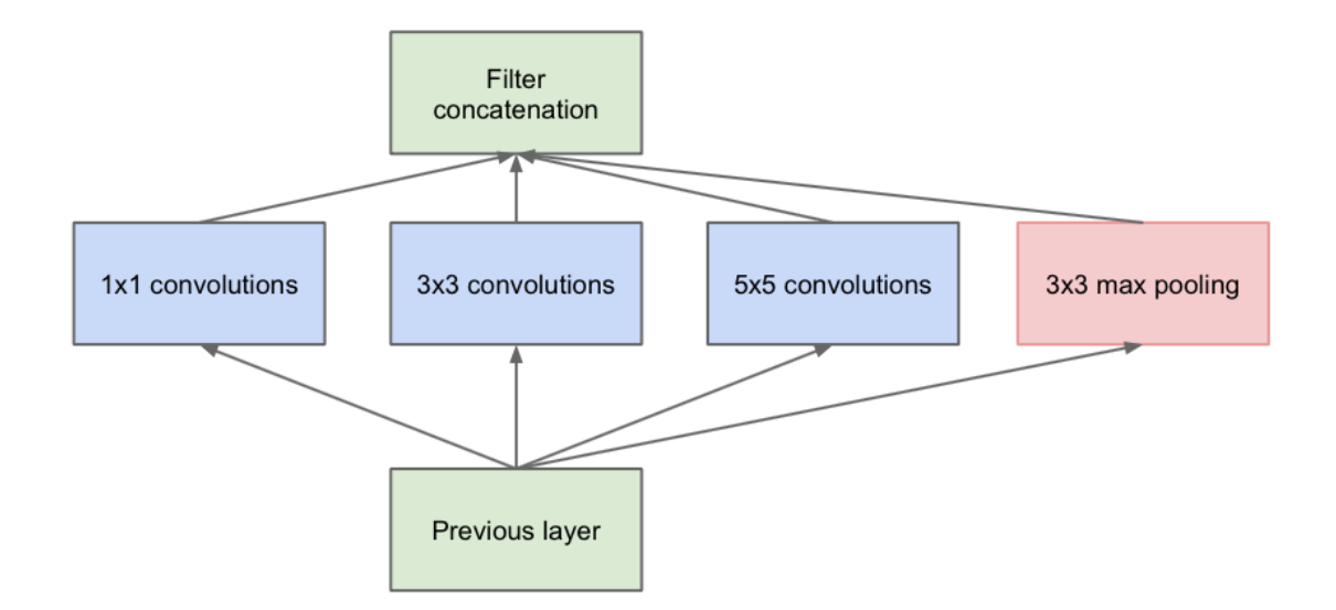 如上图所示,对前一层进行不同的卷积运算(same)后会有多个输出(不同滤波器看到的特征也不同),将这些输出的结果和池化运算堆叠在一起,得到了这一层的输出,并且作为下一层的输入。不同的卷积结果堆叠在一起使得特征具有更深的维度,多个这样的模块堆叠在一起使得网络更深。