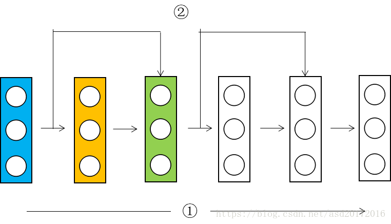 在上图中,蓝色的层输出的数据记为$X$,只考虑一号线,沿着一号线向绿色的层传播时,黄色层的输入为$X_1$,输出为$g(W_1X+b_1)$,记为$Z_1$。绿色层的输入为$Z_1$,输出记为$Z_2$。再来看上面的二号线,就是跳远连接的形式。考虑到二号线时,绿色层的输入是什么呢,是$Z_1+X_1$,即黄色层的输出加上最初的输入作为绿色层的输入。绿色层的输出是对输入的激活。上面的黄色层和绿色层就组成了一个残差块;二号线的连接形式即为跳远连接。