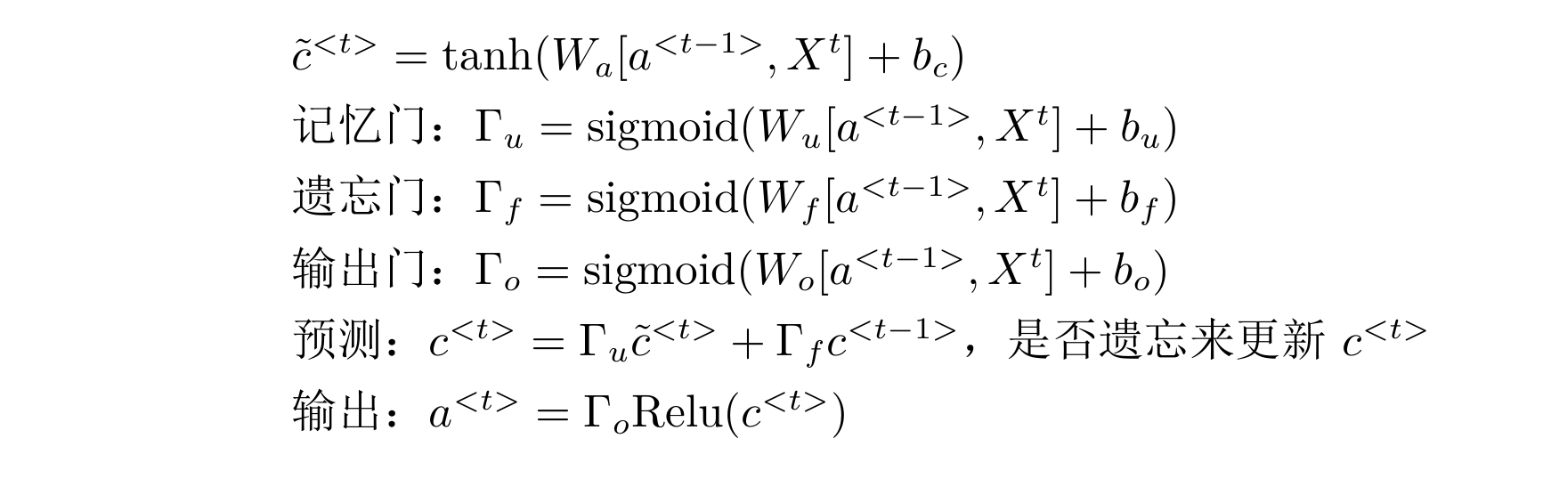 LSTM与GRU大同小异,在GRU记忆门的基础上添加了遗忘门$\Gamma_f$,公式如下: