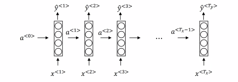 $g$表示某种激活函数如RELU,$W_{aa}$为和$a$相乘的参数,$W_{ax}$表示和样本输入相乘的参数。输出的$a^{<1>}$为下一层的输入。