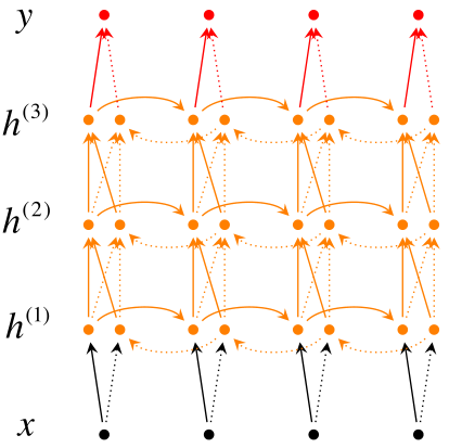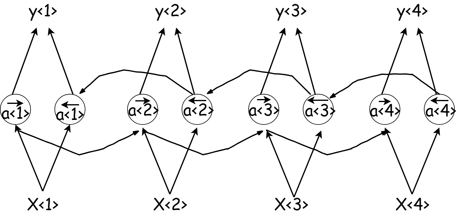 即在正向传播的过程中会有中间信息$\overrightarrow{a^t}$,此时加入一个反向行走的信息$\overleftarrow{a^t}$,(我先吐槽一下mathjax真丑,功能不够强大)。当然俩个$a$和两个$a$所用的参数是不一样的,在预测$y$的时候,加入两个$a$的信息: