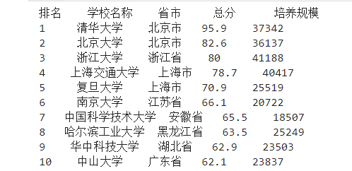 1 2 3 4 5 6 7 8 9 10 11 12 13 14 15 16 17 18 19 20 21 22 23 24 25 26 27 28 29 30 31 32 33 34 35 36 37 38 39 40 41 42 43 44 45 46 47 48 49 50 51 52 53 import  requestsfrom  bs4 import  BeautifulSoupallUniv = [] def  getHTMLText (url ):    '''      encoding是编码方式     status_code属性是返回状态,200正常,404失败     text是文本对应页面内容     raise_for_status()是方法,与status_code相同     timeout是请求超时时间     get主要是获得数据     '''     try :         r = requests.get(url, timeout=30 )         r.raise_for_status()         r.encoding = 'utf-8'          return  r.text     except :         return  ""  def  fillUnivList (soup ):                   data = soup.find_all('tr' )     for  tr in  data:         ltd = tr.find_all('td' )         if  len (ltd) == 0 :             continue          singleUniv = []         for  td in  ltd:             singleUniv.append(td.string)         allUniv.append(singleUniv) def  printUnivList (num ):    print ("{:^4}{:^10}{:^5}{:^8}{:^10}" .format ("排名" ,"学校名称" ,"省市" ,"总分" ,"培养规模" ))     for  i in  range (num):         u = allUniv[i]         print ("{:^4}{:^10}{:^5}{:^8}{:^10}" .format (u[0 ],u[1 ],u[2 ],u[3 ],u[6 ])) def  main ():    url = 'http://www.zuihaodaxue.cn/zuihaodaxuepaiming2016.html'      html = getHTMLText(url)          soup = BeautifulSoup(html, "html.parser" )     fillUnivList(soup)     printUnivList(10 )      main()