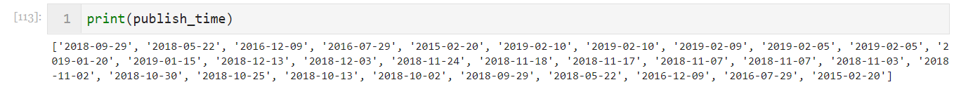 1 2 3 4 5 6 7 8 9 for  page in  range (2 , 7 ):    url = home_url + r'/page/'  + str (page) + r'/'      r = requests.get(url)     soup = BeautifulSoup(r.text, "lxml" )     body = soup.body     data = body.find_all('time' )     publish_time.extend(time.findall(str (data))) print (publish_time)