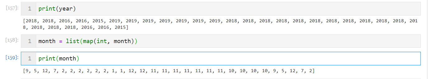 1 2 3 4 5 6 7 8 9 10 11 12 13 14 15 16 17 18 19 20 21 year = [] month = [] year_pattern = re.compile (r'\d{4}' ) month_pattern = re.compile (r'-\d{2}-' ) month_sub = re.compile (r'-' ) for  date in  range (len (publish_time)):    year.extend(year_pattern.findall(publish_time[date]))     month.extend(month_pattern.findall(publish_time[date])) for  date in  range (len (month)):    month[date] = month_sub.sub("" ,month[date]) year = list (map (eval , year)) month = list (map (int , month))