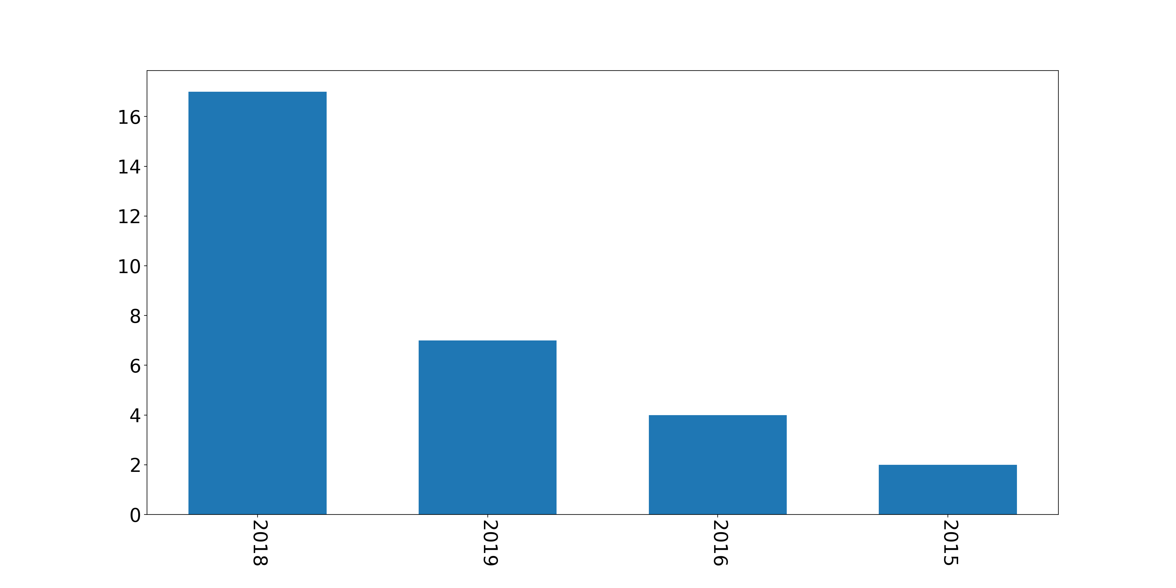 1 2 3 4 5 6 7 8 9 10 11 12 13 14 15 16 17 18 19 import  pandas as  pdyear_result = pd.value_counts(year) name_list = year_result.index num_list = year_result.values plt.figure(figsize=(20 , 10 )) plt.bar(range (len (num_list)), num_list, width=0.6 , tick_label=name_list) font2 = { 'weight'  : 'normal' ,'size'    : 30 ,} plt.tick_params(labelsize=23 ) plt.xticks(rotation=270 ) plt.savefig('test1.png' , dpi=200 )