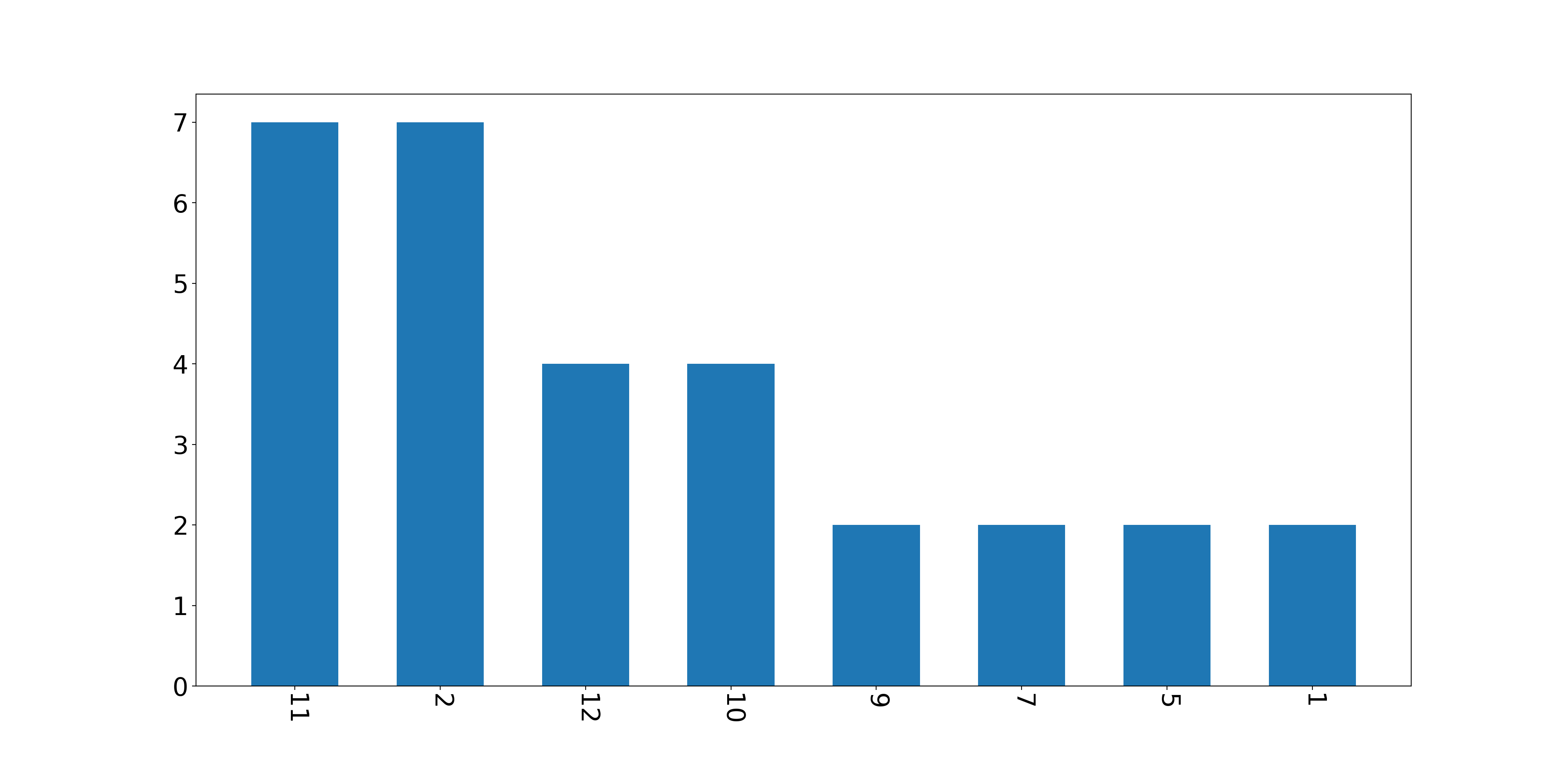 1 2 3 4 5 6 7 8 9 10 11 12 13 14 15 16 17 month_result = pd.value_counts(month) name_list = month_result.index num_list = month_result.values plt.figure(figsize=(20 , 10 )) plt.bar(range (len (num_list)), num_list, width=0.6 , tick_label=name_list) font2 = { 'weight'  : 'normal' ,'size'    : 30 ,} plt.tick_params(labelsize=23 ) plt.xticks(rotation=270 ) plt.savefig('test2.png' , dpi=200 )