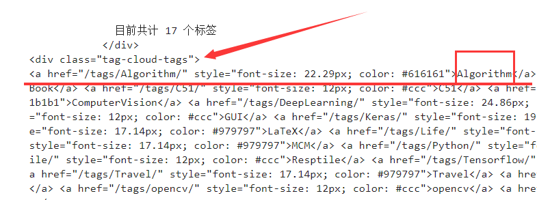 爬取标签数量 然后我们查看body中的内容,发现所有的标签是这样的,标签都位于div中类名是tag-cloud-tags里面,然后还需要获取标签的内容:标签都位于tag-cloud-tags中的a部分。图太大了,没截全。