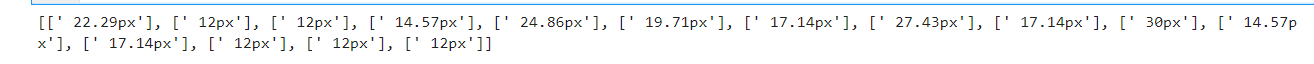 1 2 3 4 5 p_size = re.compile ('\s\d{2}.*px' ) tag_size = [] for  i in  range (len (a)):    tag_size.append(p_size.findall(str (a[i])))  print (tag_size)