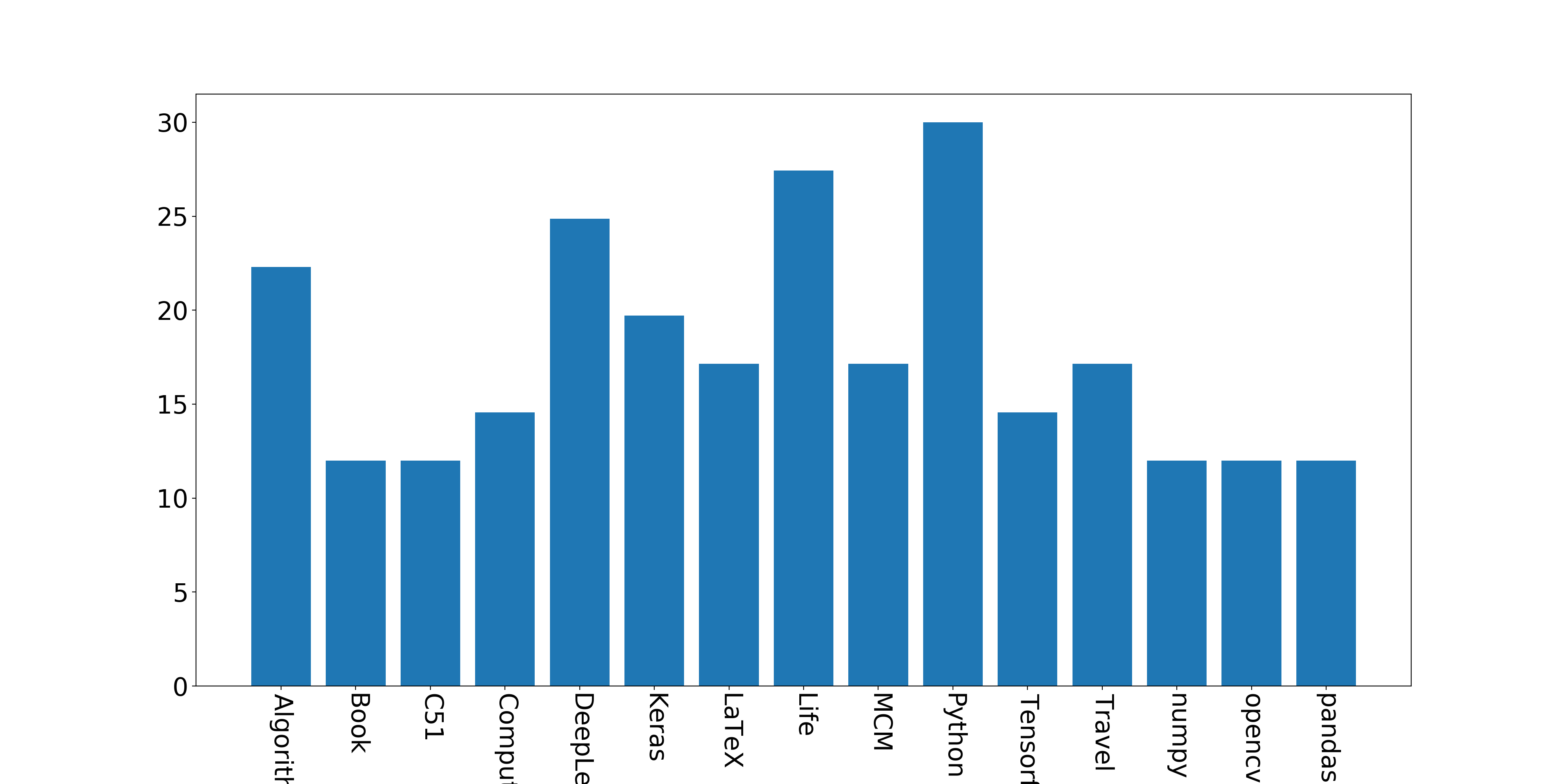 1 2 3 4 5 6 7 8 9 10 11 12 13 14 15 16 17 18 import  matplotlib.pyplot as  plt  name_list = tag_name num_list = tag_size plt.figure(figsize=(20 , 10 )) plt.bar(range (len (num_list)), num_list, width=0.8 , tick_label=name_list) font2 = { 'weight'  : 'normal' ,'size'    : 30 ,} plt.tick_params(labelsize=23 ) plt.xticks(rotation=270 ) plt.savefig('test.png' , dpi=200 )