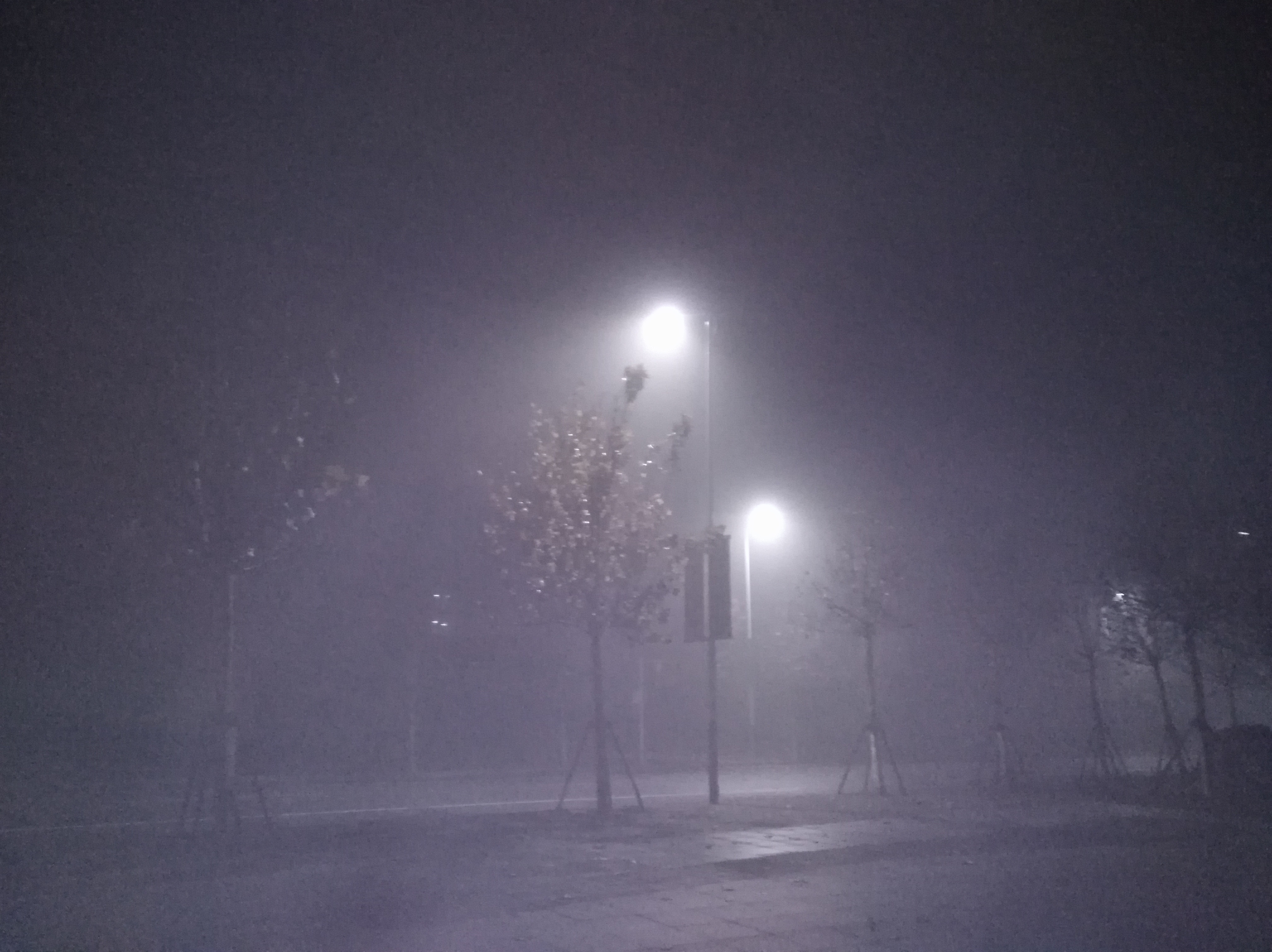 看到了凌晨一点的夜景,学校位于湿地所以空气湿度大,烟雨朦胧下有种江南烟雨的感觉,或者说是秋风萧瑟了北国的温柔。