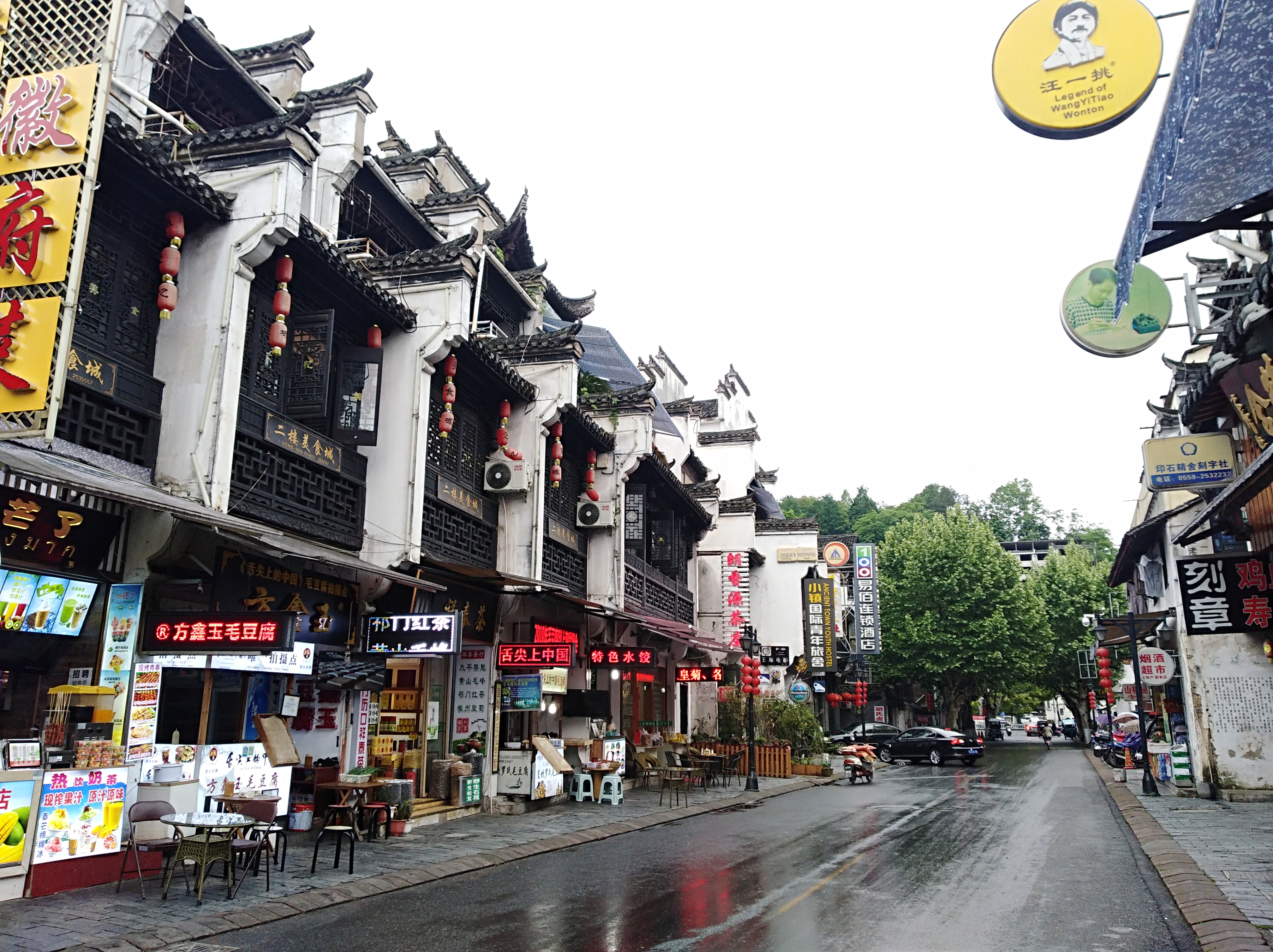 我是最后一天去的老街,在看完黄山之后返回火车站,距离火车出发还早,于是坐公交(前文提到的公家卡)去老街溜了圈,在18楼俯瞰整个黄山市是黑白色的建筑,正好赶上天青色的烟雨。古朴的建筑和淳朴的民风,一条街好多东西都免费吃。买了个书签和特产就回来了,反正不贵。
