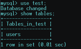 在MySql中查看创建信息,其中 use test;表示使用当前数据库,show tables;表示查看当前数据库的所有数据表。