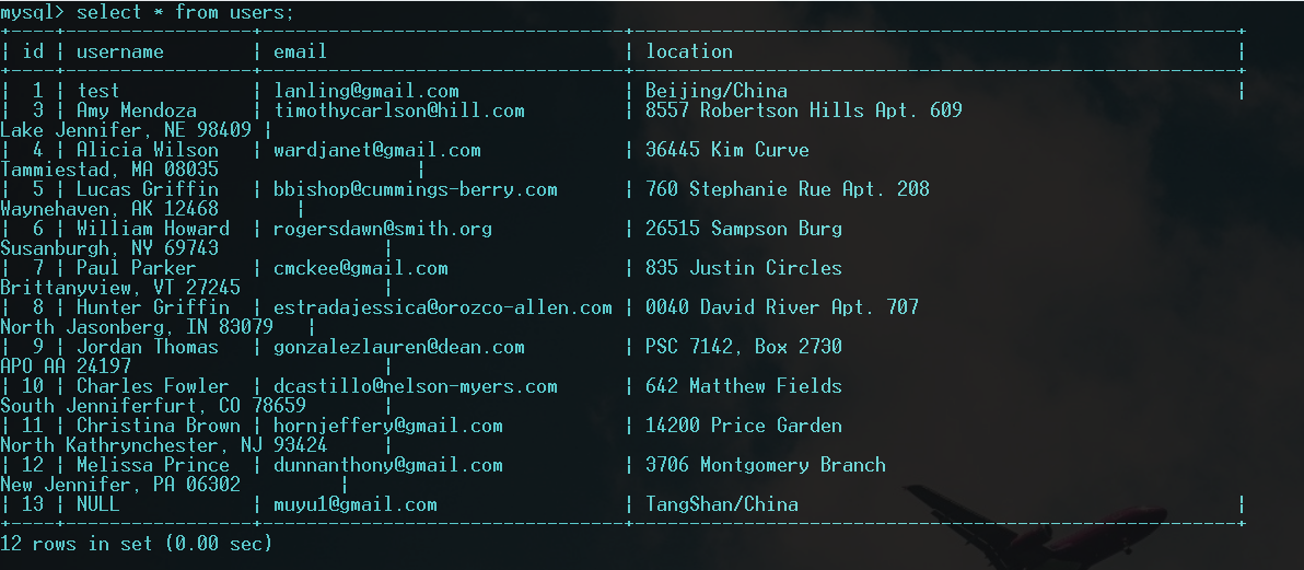 1 | bob = User(username='test', email='test@gmail.com', location='BeiJing/China') |