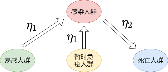 同时暂时免疫状态会以概率$\eta_1$再次变为被感染状态$I$;