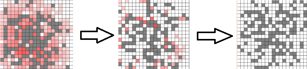 以红色代表感染状态,且颜色越深感染时间越长,灰色代表死亡状态,白色代表康复状态。下图描绘了加入药物治疗因素后,对埃博拉病毒的根除效果,感染人数(红色元胞)逐渐减少,逐渐转化为白色元胞,即被感染患者逐步开始被治疗。