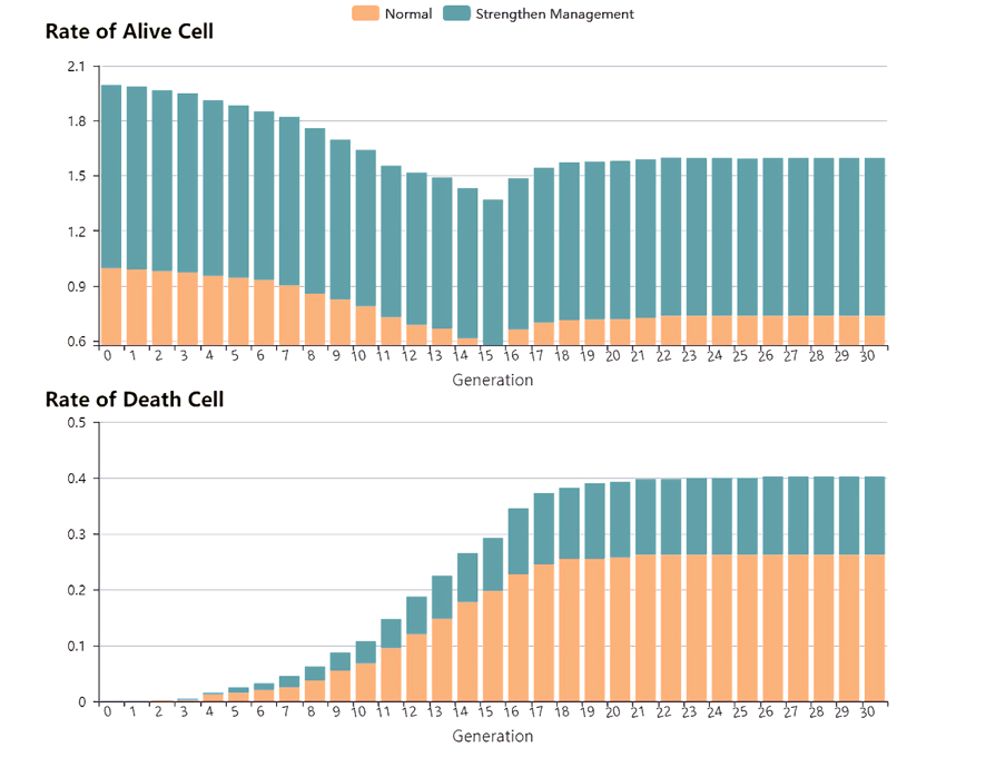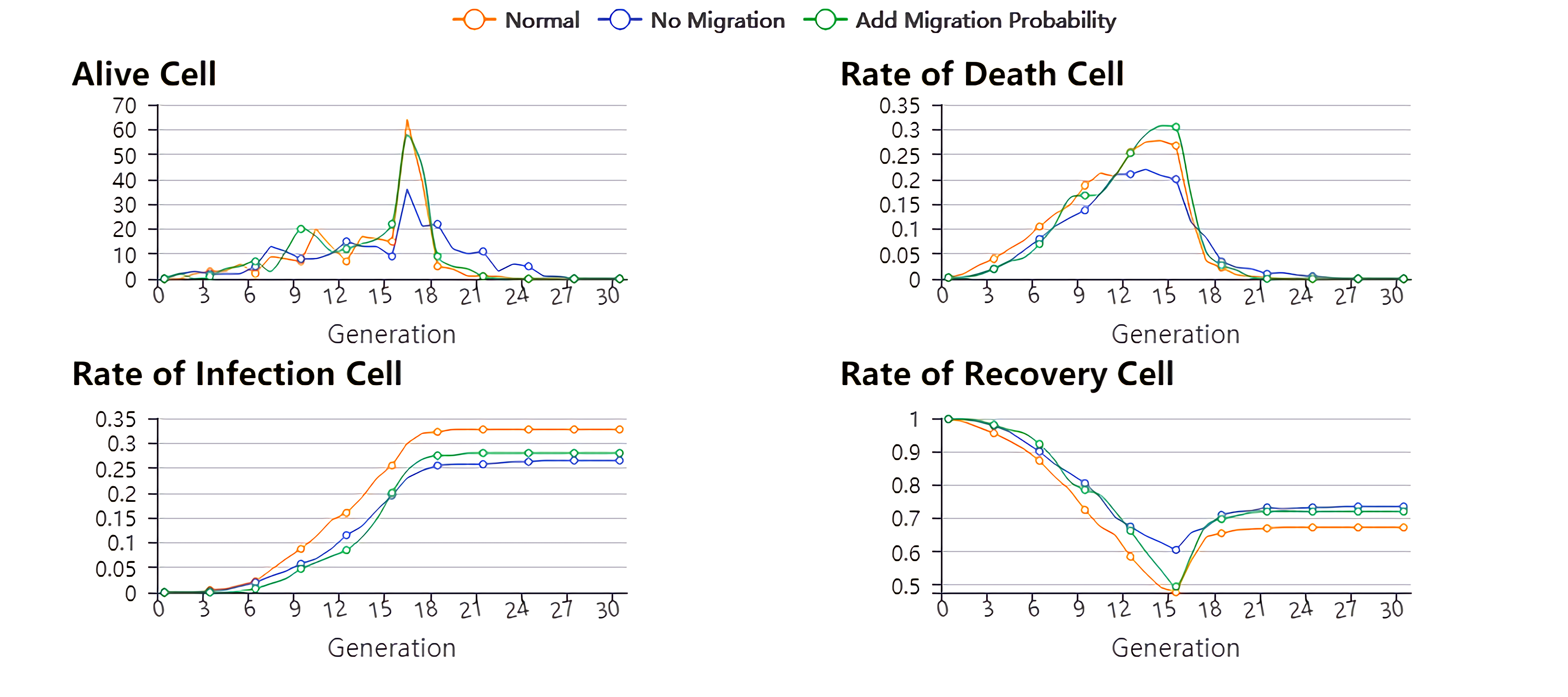 如图所示,当不存在人口流动现象时,元胞的存活率最高,即更少的人会被病毒感染,元胞的被感染几率最低,死亡率最低。而随着流动频率与流动范围的增加,元胞被感染几率上升,死亡率也上升。因此,人口流动现象影响了疾病传播情况,也影响了死亡率与感染率,因此,对于国家政府而言,应采取“戒严”形式,减少人口流动频率,对于减缓疾病传播与降低死亡率有着至关重要的作用。