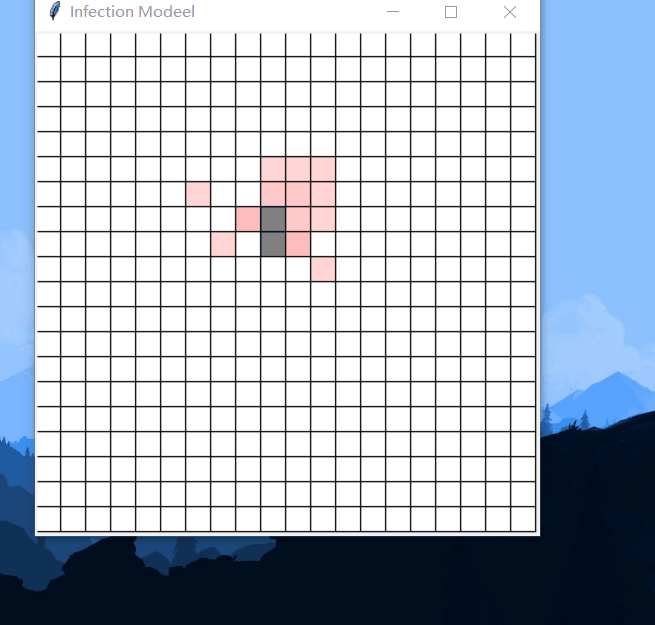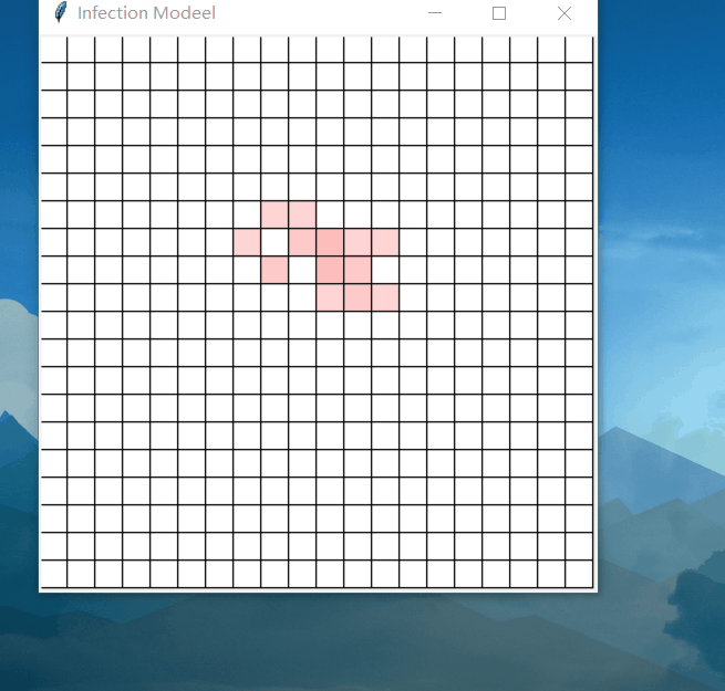 - 缺少计算服务器,因此元胞数量设置为$20\times 20$,用于表示并模拟区域内疾病的传播,进而得到患病者死亡率、感染率的分布规律。并且定义灰色表示死亡状态;红色表示已经被感染状态,且颜色越深代表被感染时间越长;白色表示易染状态和暂时免疫状态。