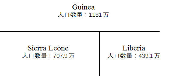在前期工作中,我们了解到在一个区域内,会因人口密度、人口数量不同,而导致感染水平不同。即在人口密度大的城市,感染水平会高于人口密度低的城市,人口密度在很大程度中影响疾病传播率。因此元胞自动机模拟埃博拉传染过程中,设定CA的每一个方格代表人口密度,并且每个方格所代表的人口密度相同。并根据三个国家的人口数量比例划分元胞空间,划分域如下。