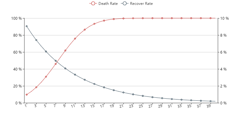 计算真实死亡率与康复率:目前只提出了理论死亡率与理论治愈率的计算方法,因假设死亡率随时间增加符合正态分布,因此死亡率会逐渐增加,并十分接近100%,因此提出的理论情况并非真实情况下的死亡率与康复率。在实际情况中,当死亡率很高时,仍会有个体康复;在个体康复率很高时,仍会有个体死亡;为表示这一关系,采用下列方程式计算真实情况下的康复率与死亡率:
