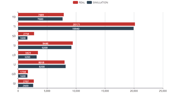 我们计算元胞自动机模拟结果中几内亚感染数(GI)与几内亚死亡数(GD)比例,塞拉利昂感染数(SI)与塞拉利昂死亡数(SD)比例,利比里亚感染数(LI)与利比里亚死亡数(LD),总感染案例(TI)与总体死亡数(TD),(格子数乘以对应人口密度)。并与原始数据对比,得到的对比情况如下图。