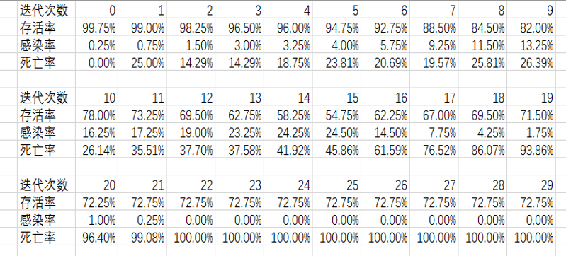 - 假设 CA 的迭代次数$i$时,每一次迭代可视为模拟的埃博拉病毒传播$\lambda$天的传染效果,其中$\lambda$为迭代一次代表的时间长度,则$\lambda=365/i$。
