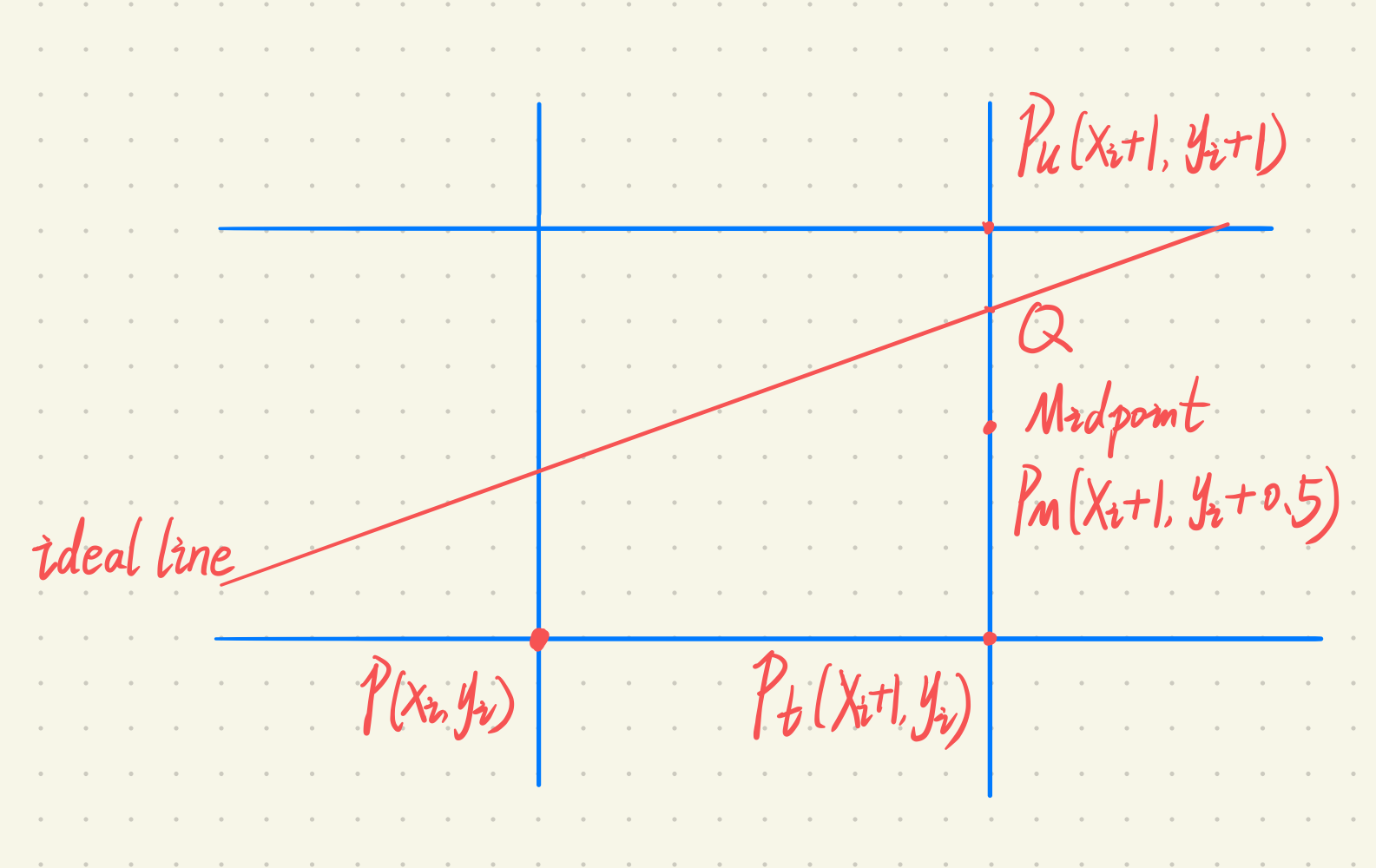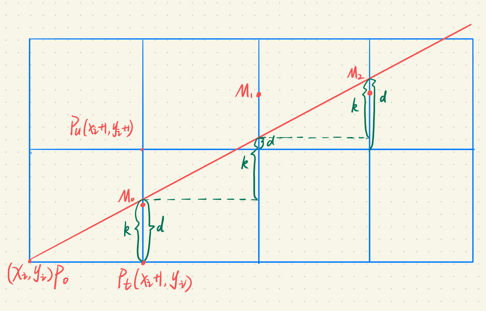 真实感图形往往调用成千上万次的画线程序,因此这个算法影响了图形的质量和显示速度。在函数$y=kx+b$中,存在$kx$的乘法运算,而计算机最快的运算是加法,所以接下来要取消乘法的运算。