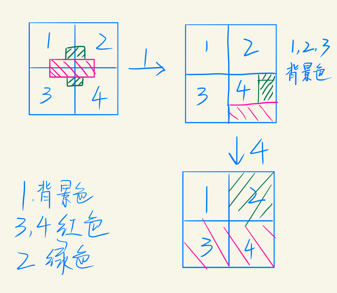 按照扫描线的思想,同款区间设置同款颜色,而相交的区间取决于谁在前。而在染色时,一个像素决定了一个区间的颜色,以逐段染色的方式对区间进行染色。