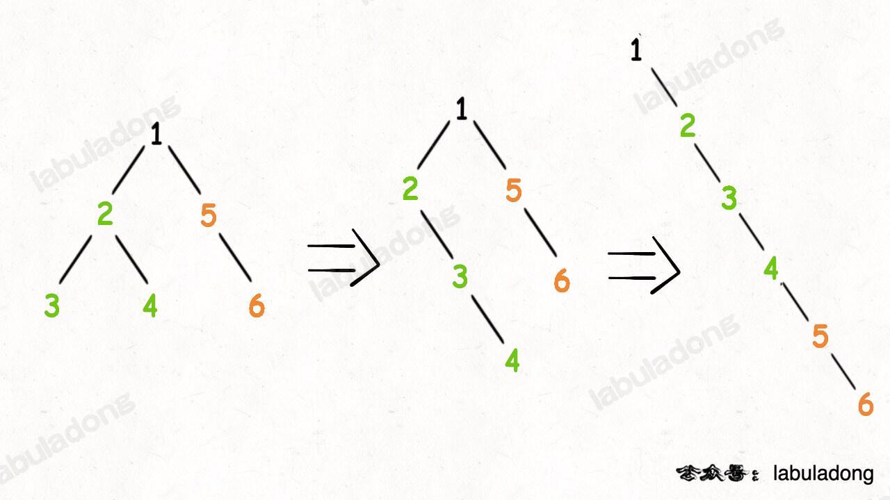 在展平之后,根节点的右指针指向左子树,然后移动到左子树的末尾,在指向右子树即可