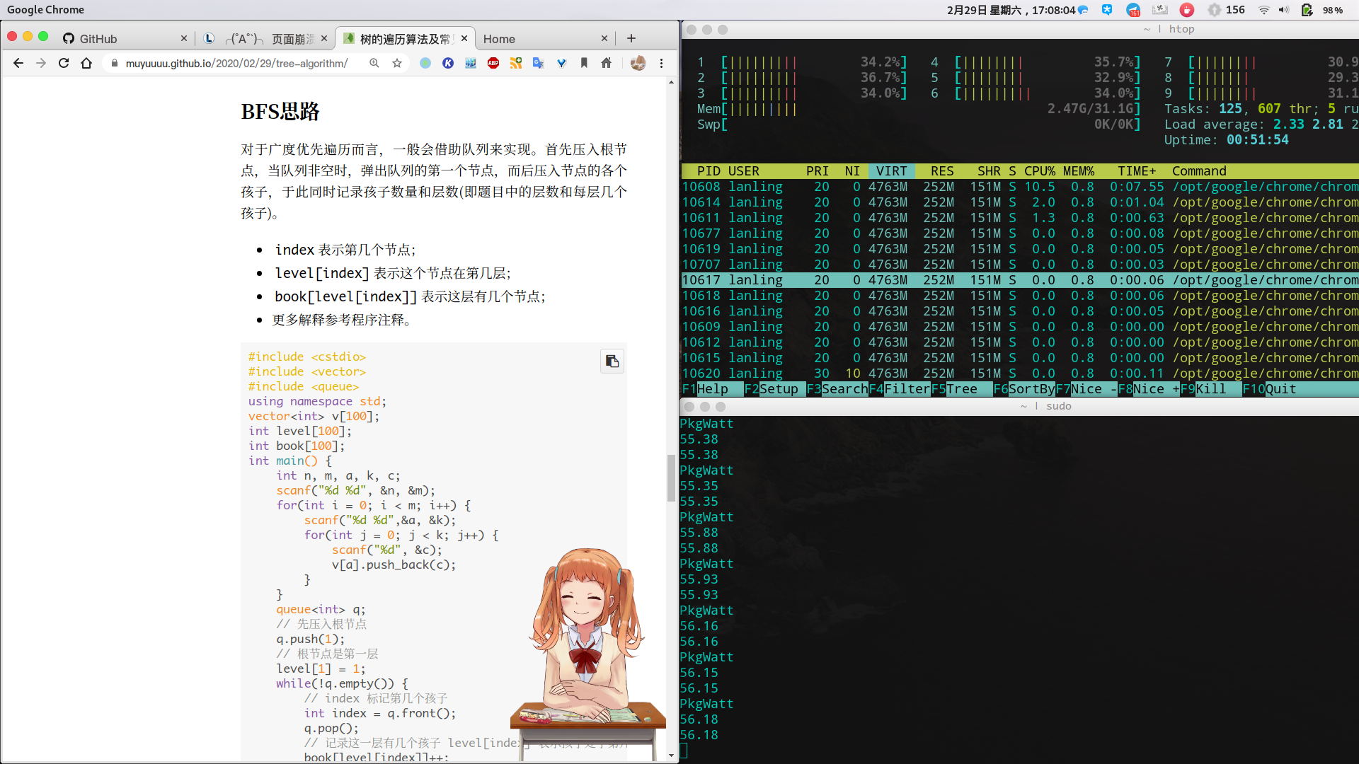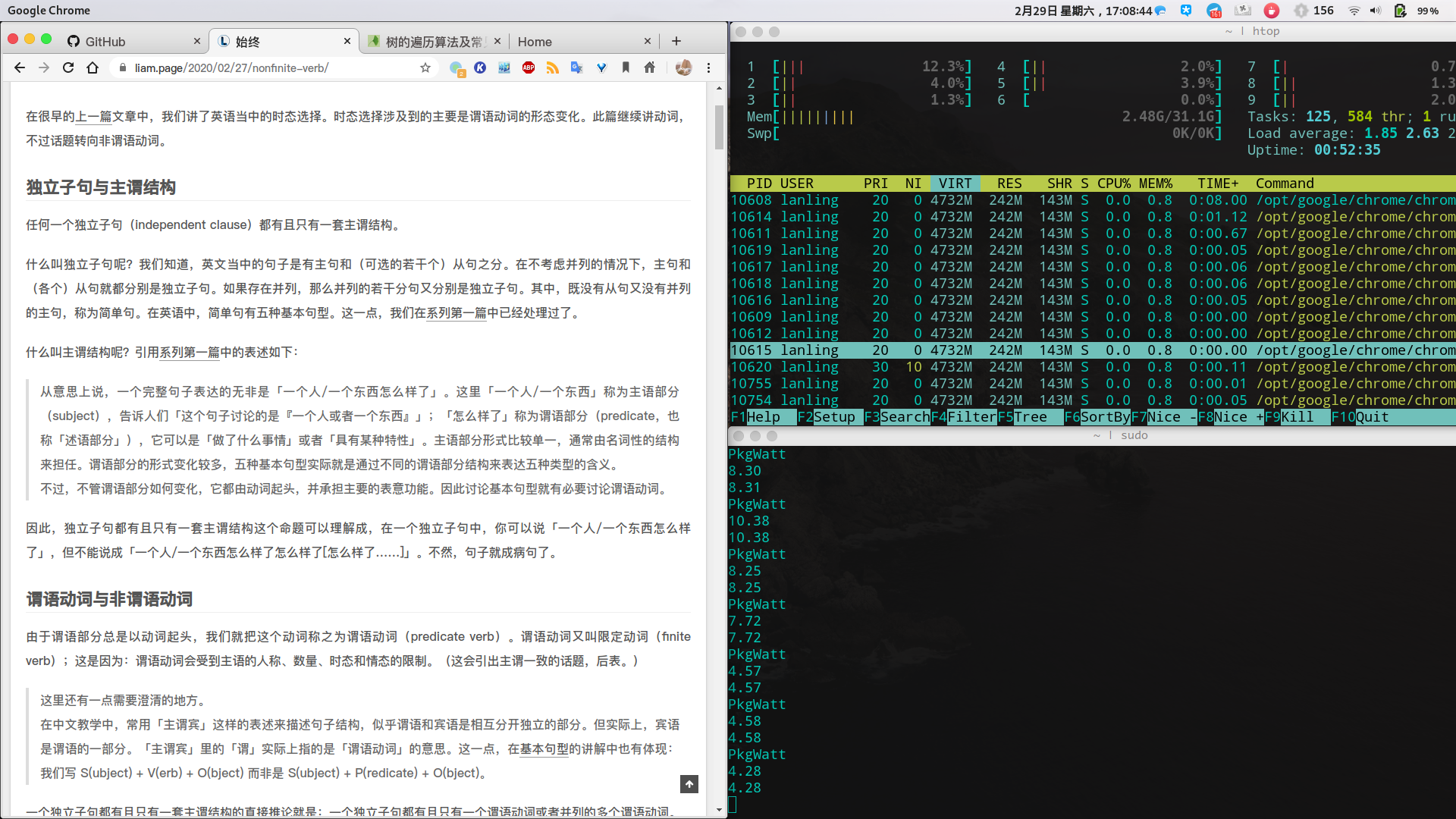 扯远了,回归正题,如何降低博客的功耗呢?我第一次发现问题是在Linux系统中,打开我的博客后发现,电脑风扇在飞速旋转,键盘也开始发烫。嗯?这是为何,我也没载入杀病毒啊。找了一个查看功耗的命令显示下现在的功耗。右上角为查看CPU,内存等利用率,右下角为功耗,单位W。可以看到,我博客当初的功耗为55W。