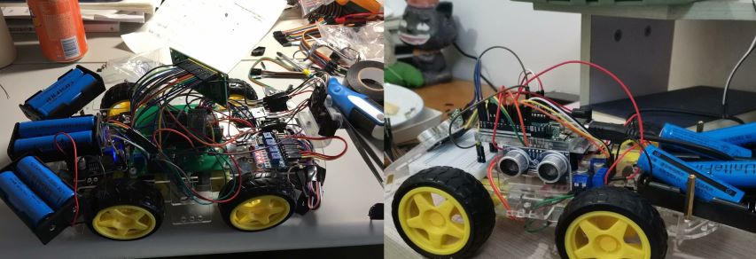 左图是两年前做的,包括:蓝牙、电机、液晶、加速减速、避障、巡迹等常见功能;右图是今年的做的,只有雷达、电机和蓝牙,更多的是PC端的上位机。