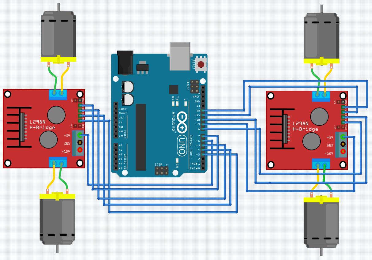 将L298N的四个入口引脚IN1,IN2,IN3和IN4接Arduino的控制引脚,此时Out1,Out2连接一个电机,Out3,Out4出口引脚连接另外的电机。通过对4个入口引脚赋值来更改出口引脚的电平输出,进而控制电机的正反转,完成前进、后退和转向的功能。此外可以通过总开关ENA,ENB两个使能端控制两个电机能否转动和转速。电路连接方式下: