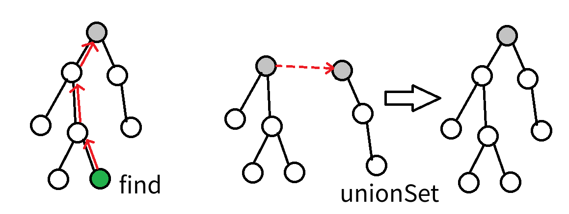 画成图就是这样的:右图的 union 表示两个集合合并后,更改一个节点的父节点(且左子树的父节点都要更改);左图中的 find 表示绿色节点在找根节点是谁,并修改这条路上所有节点的根节点。