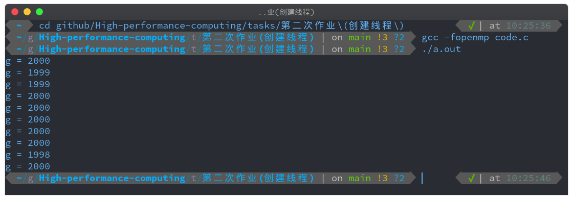 1 2 3 4 5 6 7 8 9 10 11 12 13 14 15 16 17 18 19 20 21 22 23 24 25 26 27 28 29 30 31 32 33 #include <stdio.h> #include <pthread.h> #define NUM_THREADS 2000 int g = 0 ;void * count (void * args) { g++; } int main () { pthread_t tids[NUM_THREADS]; for (int j = 0 ; j < 10 ; j++){ for (int i = 0 ; i < NUM_THREADS; ++i) { int ret = pthread_create(&tids[i], NULL , count, NULL ); if (ret != 0 ){ printf ("pthread_create error: error_code = %d" , ret); } } for (int i = 0 ; i < NUM_THREADS; i++) { pthread_join(tids[i], NULL ); } printf ("g = %d\n" , g); g = 0 ; } return 0 ; }