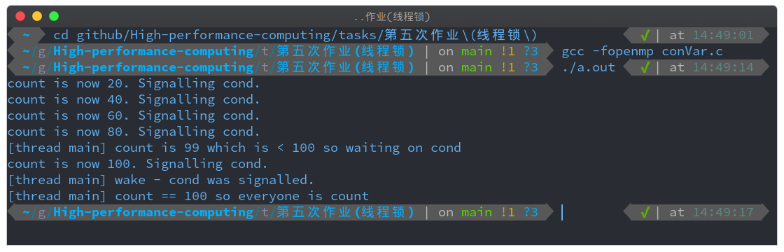 1 2 3 4 5 6 7 8 9 10 11 12 13 14 15 16 17 18 19 20 21 22 23 24 25 26 27 28 29 30 31 32 33 34 35 36 37 38 39 40 41 42 43 44 45 46 47 48 49 50 51 52 53 54 55 56 57 58 #include <pthread.h> #include <stdio.h> #include <unistd.h> #include <assert.h> int NUMTHREADS = 100 ;int count = 0 ;pthread_mutex_t mutex = PTHREAD_MUTEX_INITIALIZER;pthread_cond_t cond = PTHREAD_COND_INITIALIZER;void *ThreadEntry () { pthread_mutex_lock(&mutex); count++; if (count % 20 == 0 && count != 0 ){ printf ("count is now %d. Signalling cond.\n" , count); pthread_cond_broadcast(&cond); } pthread_mutex_unlock(&mutex); } int main (int argc, char **argv) { pthread_t threads[NUMTHREADS]; for (int t = 0 ; t < NUMTHREADS; t++) pthread_create(&threads[t], NULL , ThreadEntry, NULL ); pthread_mutex_lock(&mutex); while (count != NUMTHREADS) { printf ("[thread main] count is %d which is < %d so waiting on cond\n" , count, NUMTHREADS); pthread_cond_wait(&cond, &mutex); } puts ("[thread main] wake - cond was signalled." ); pthread_mutex_unlock(&mutex); printf ("[thread main] count == %d so everyone is count\n" , count); pthread_cond_destroy(&cond); pthread_mutex_destroy(&mutex); return 0 ; }